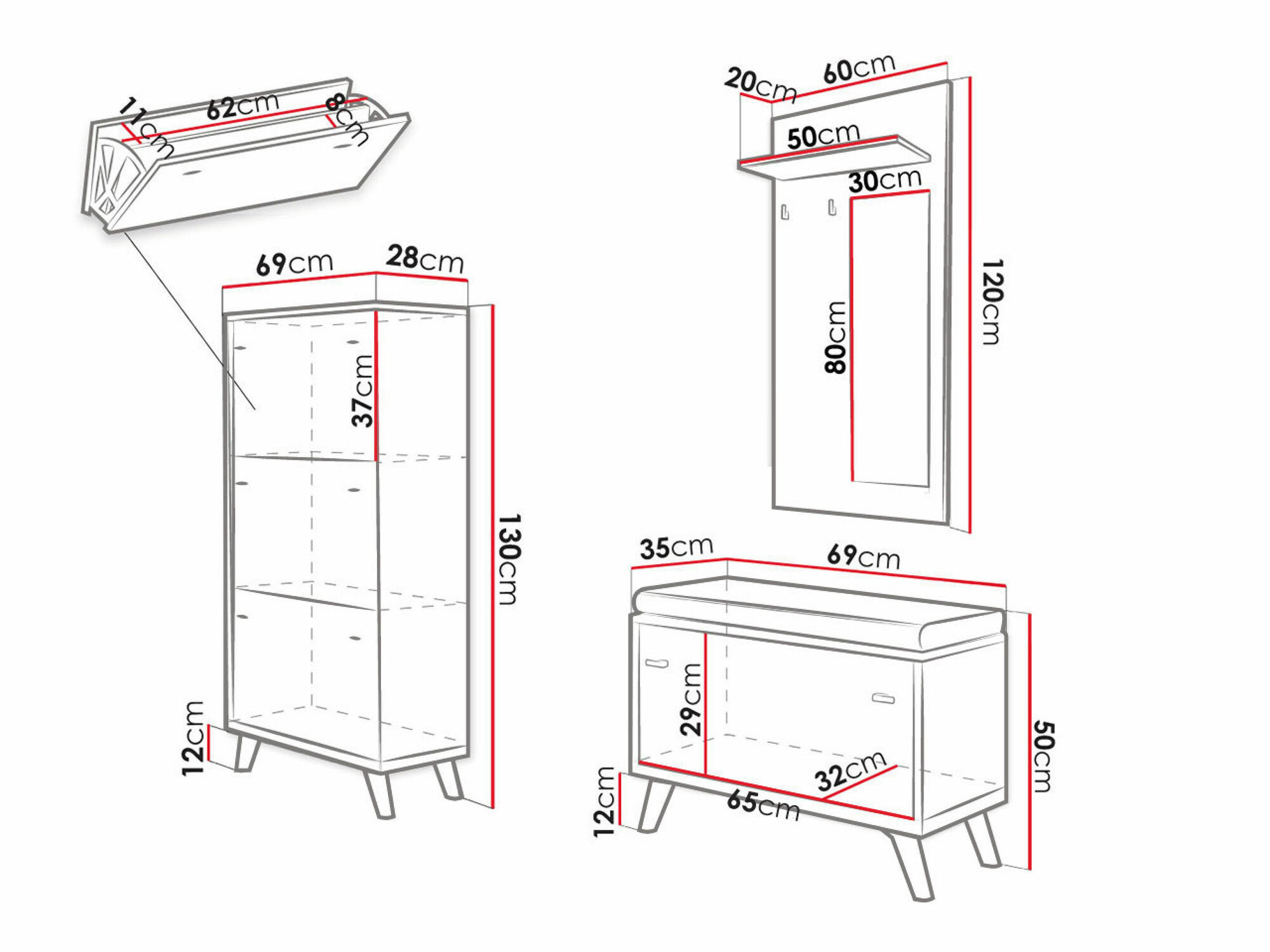 Мебелите изглеждат точно като на снимките! Поради факта, че са с малък размер, комплектът изобщо не е претъпкан, въпреки че го сложих в малък коридор. Единственият недостатък е, че по-големите ботуши / боти не се събират добре.