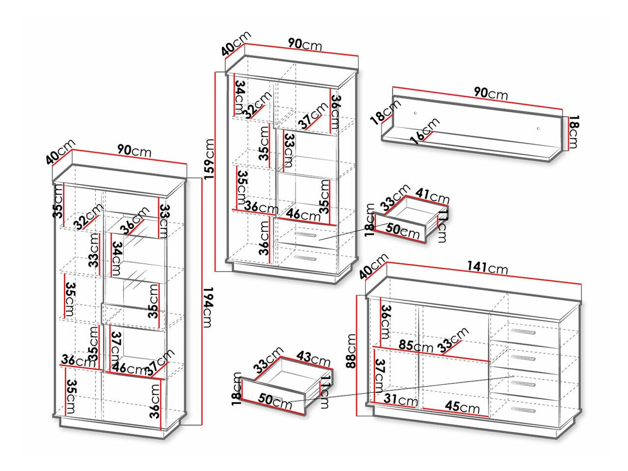 159 x 90 x 40; 194 x 90 x 40 cm