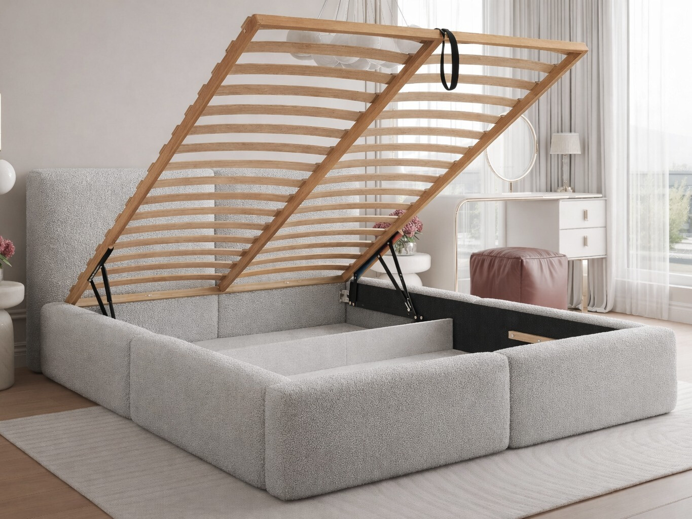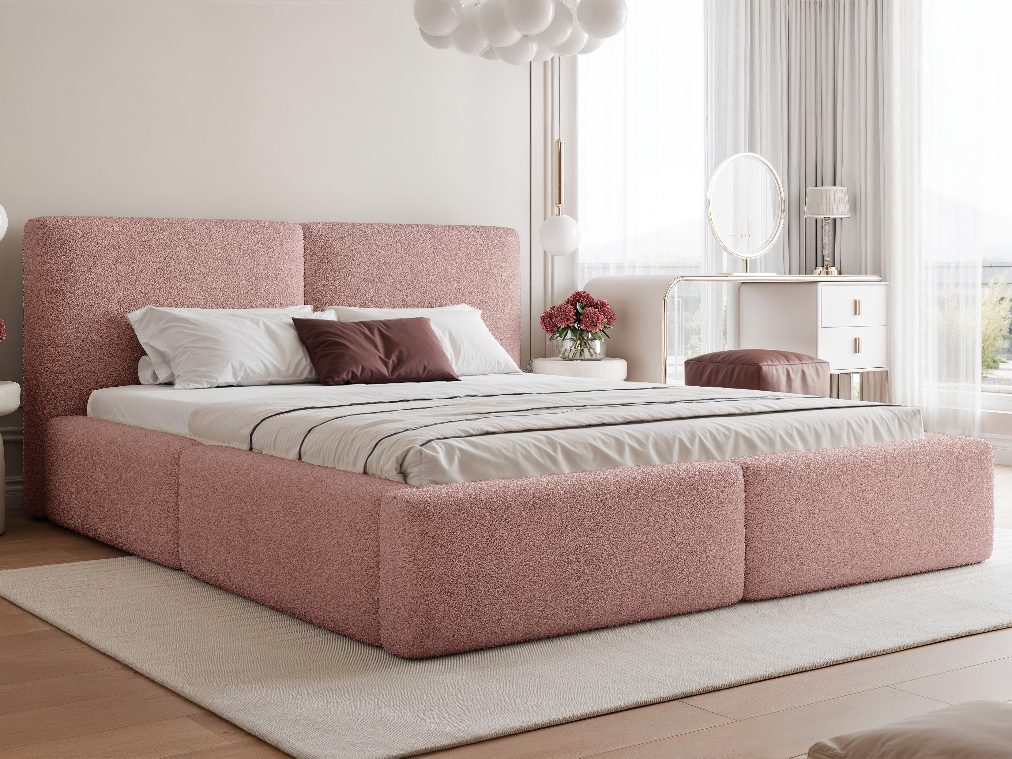 Плат, изработен от рециклиран полиестер, с шарка от бримки и възли с различни размери, заедно с фин блясък, който придава на мебелите отличителен характер. Препоръчва се повърхността на плата да се почиства само с нежни почистващи продукти, специално предназначени за тапицерия.