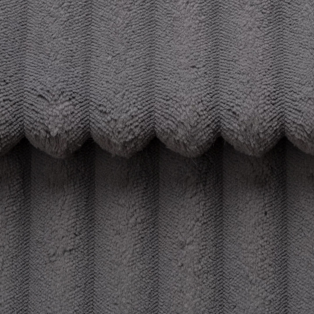 Меката текстура на този плат се състои от релефни ивици с ширина приблизително 2,5 см, покрити с плюшено покритие. Финият блясък добавя нотка лукс, а гладката повърхност позволява на плата да променя нюанса си в зависимост от осветлението. Този плат е отличен избор както за модерен, така и за минималистичен интериор. За поддръжка почиствайте повърхността само с нежни почистващи препарати, предназначени за тапицерия.